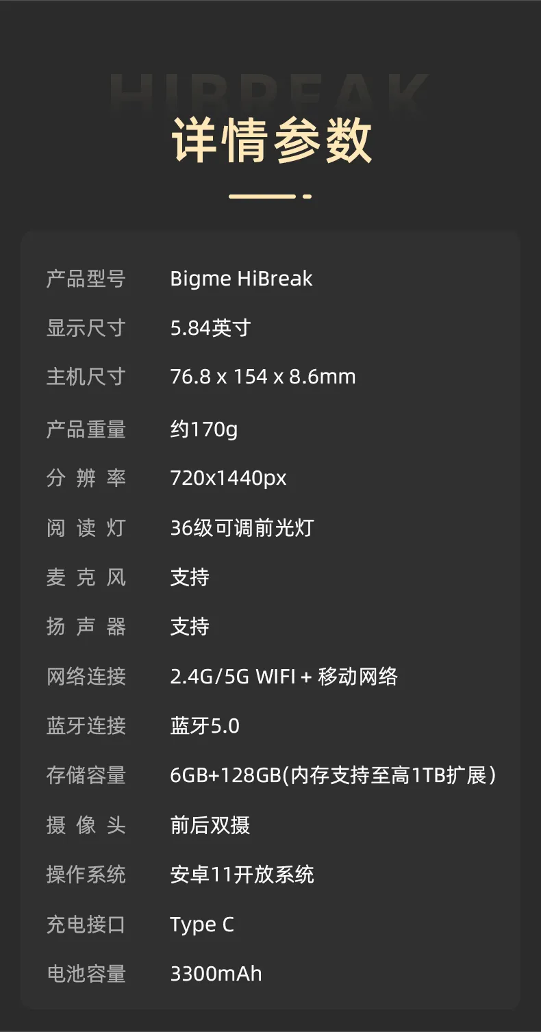 Bigme 大我墨水屏手机 HiBreak 首发版本搭载 MTK6765 处理器,配备 6GB+128GB 内存组合,预装安卓 11 系统。
